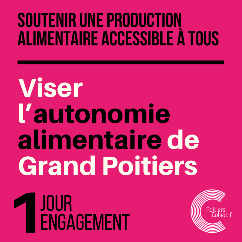 L’alimentation est un levier majeur pour la transition écologique de notre territoire, mais elle recouvre aussi des enjeux de justice sociale : pour que chaque habitante et chaque habitant puisse en bénéficier, c’est à la collectivité de s’en saisir, pour proposer une politique publique égalitaire. Que chaque habitant-e de Grand Poitiers ait accès à une nourriture suffisante, saine et diversifiée, produite sur le territoire : c’est notre objectif !