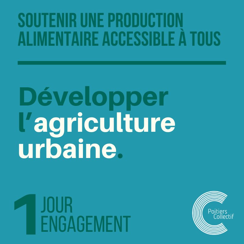 L’ambition que nous porterons pour Grand Poitiers : recréer une ceinture urbaine autour de Poitiers, pour atteindre l’autonomie alimentaire de notre territoire ! Avec plus d’agriculteurs, plus de terres agricoles consacrées à l’alimentation humaine, et un développement de l’agriculture urbaine. D’autre part, Poitiers Collectif soutiendra toutes les initiatives individuelles ou collectives des jardiniers qui s’engagent pour une plus grande autonomie alimentaire de leurs potagers. Faisons de Poitiers une ville jardinée et de Grand Poitiers un territoire nourricier pour tous ses habitant-es !