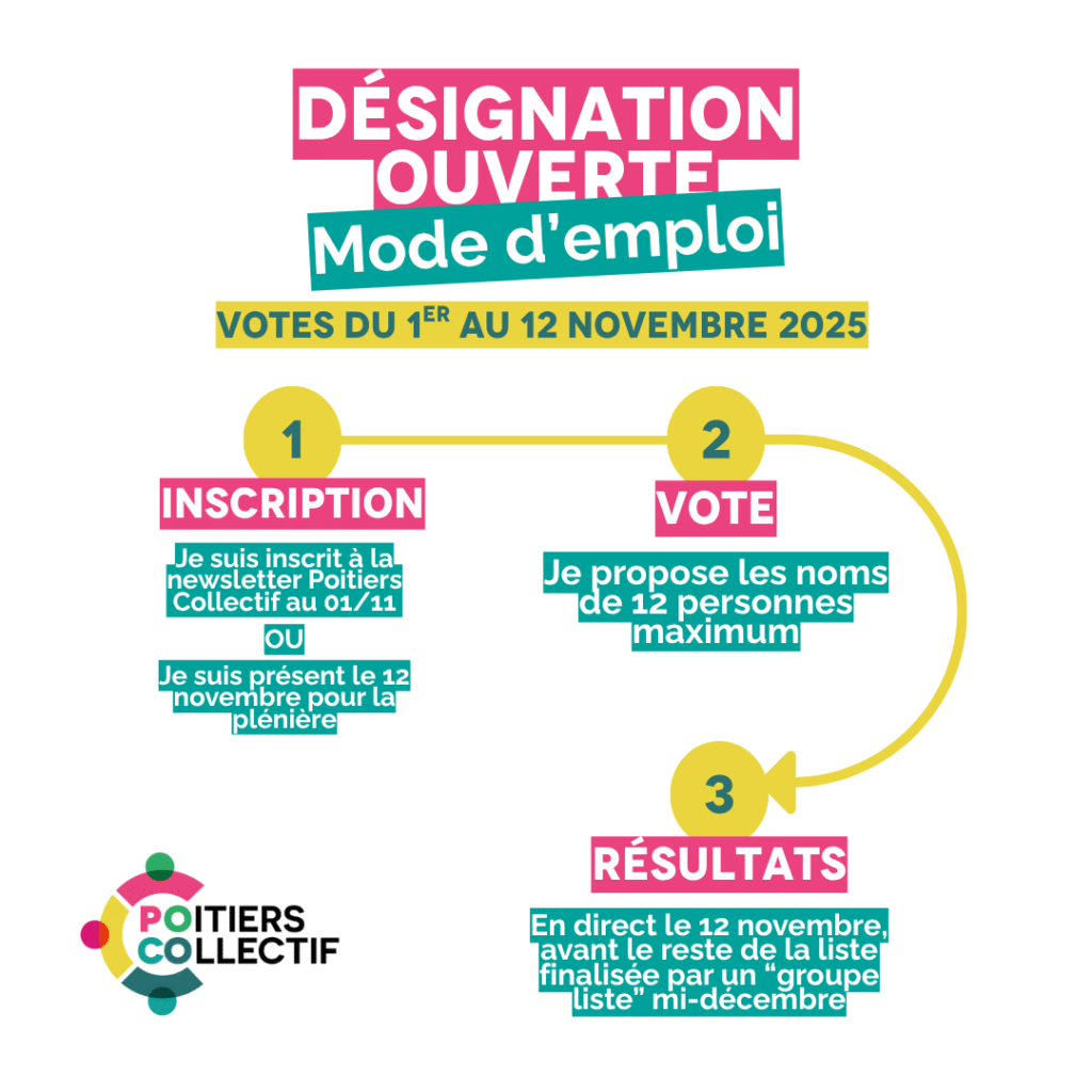 Le vote, lancé en ligne à partir du 1er novembre et jusqu’au 12 novembre, ouvert aux environs 1000 abonnés de la newsletter de Poitiers Collectif, et aux participant·es à la plénière du 12 novembre pour un vote “physique”, permettra de proposer jusqu’à douze noms répartis en trois catégories : élu·es de l’actuelle équipe municipale, personnes engagées dans Poitiers Collectif, et habitant·es que l’on souhaite voir s’engager pour qui ils sont, pour ce qu’ils font. .